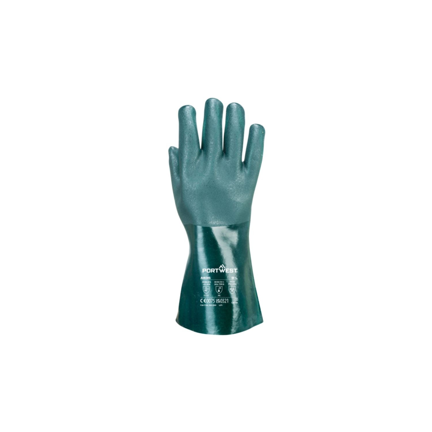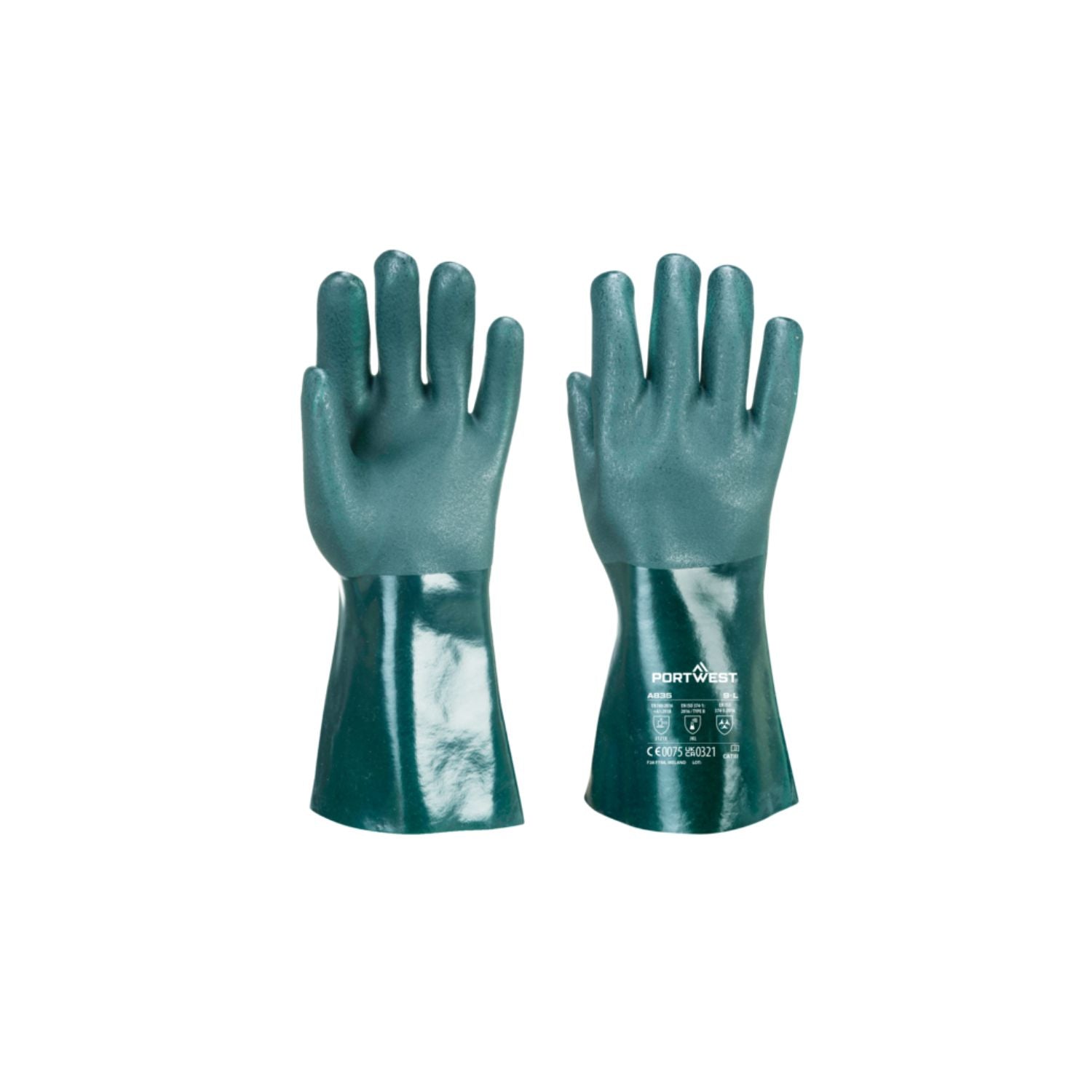 The A835 Chem 350 Gauntlet delivers robust chemical resistance while providing superior comfort and dexterity for a wide range of industrial tasks. Constructed with a durable double-dipped PVC coating and a sandy palm finish, this gauntlet ensures excellent grip in wet and dry conditions. The jersey lining offers extra comfort for prolonged wear, making it an ideal choice for chemical handling, cleaning, and maintenance tasks.